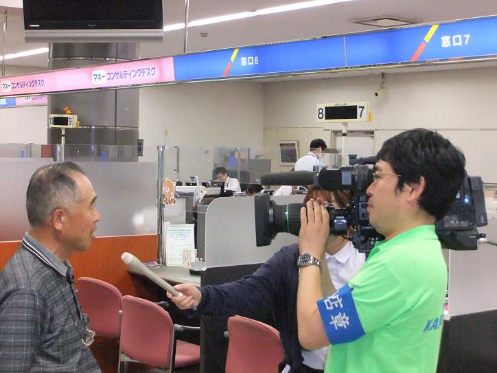 被害役に扮する地域安全推進員石井さんが何とか預金を引き出そうとしています。