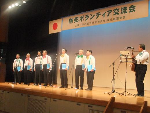 ボランティア団体として「高屋東小学校区防犯ボランティア」「寺西防犯隊」「正力地区わがまちをまもり隊」の3団体の発表を頂きました。基調講演として広島県警察本部なくそう犯罪情報 岡崎警視からのお話しがあった後、おじさんコーラスグループ「ダックスフンド」の皆さんによる「犬のお巡りさん」など童謡を多く歌って戴き、交流会は和やかに盛り上がりました。また、会に先立ち、防犯活動にご尽力頂いた方の功労表彰を行いないました。
