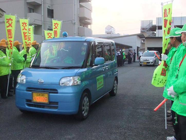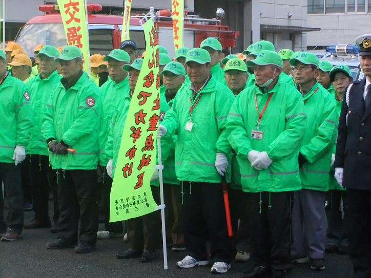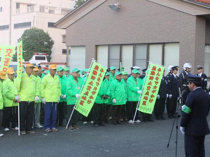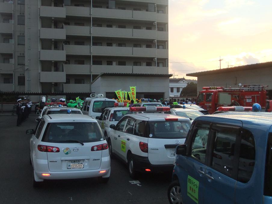12月11日16時30分から東広島警察署において、警察署並びに東広島市防犯連合会、東広島安全協会主催による「年末警戒出発式」を開催した。石宮警察署長の訓辞の後、市役所からの来賓挨拶があり、その後、参加者80名とパトカー、白バイ、消防車そして11台の市内青パトが西条駅に向けて出発していった。西条駅では、JR乗降客に対し年末警戒の啓発活動を行った。