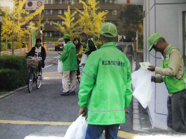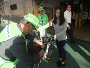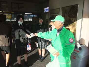 駅前駐輪場出入口にてチラシを配布する地域安全推進員