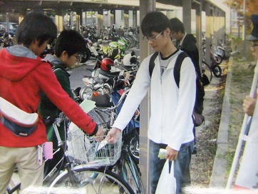 さらに、16日夕刻は、広島大学正門付近及び、構内において、広大の学生さんと下見地区の地域安全推進員により、自転車用ワイヤーロック100個、ツーロック啓蒙用のチラシなどを配布し自転車盗防止の啓発活動を行った。
