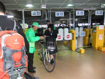 JR西条駅駐輪場出入口で自転車用カゴネットをつける地域安全推進員